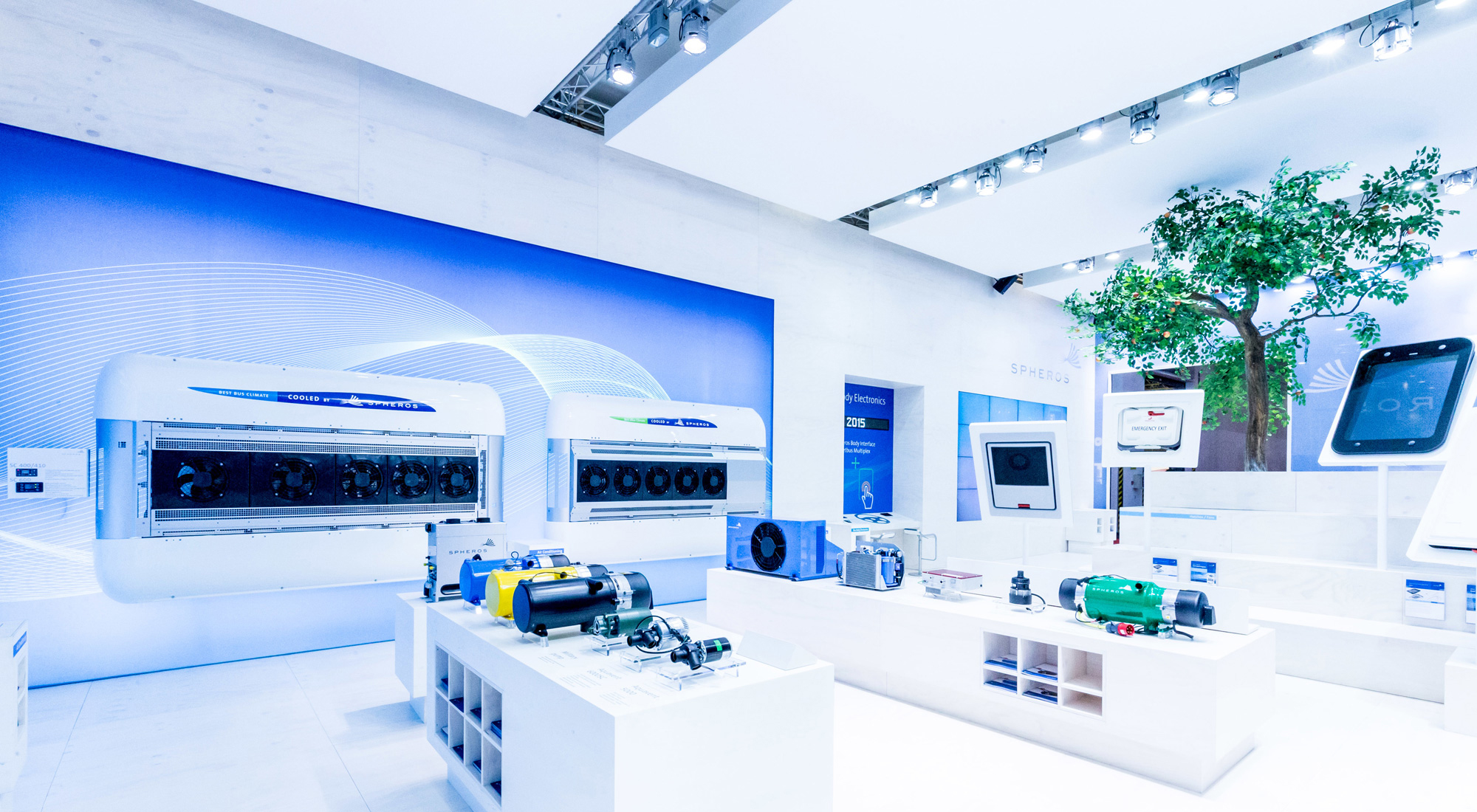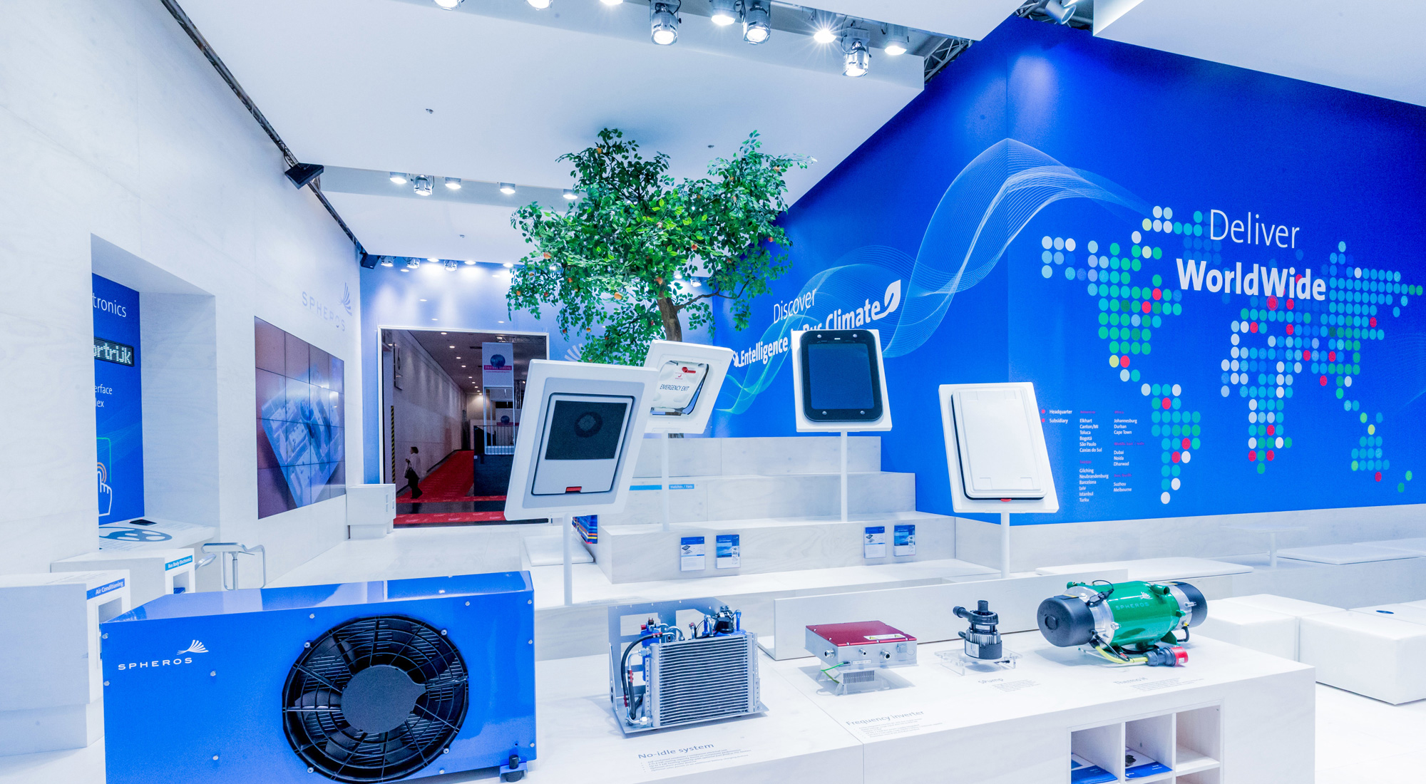 Production of the exhibition stand for SPHEROS for Busworld at Kortrijk, Belgium in cooperation with Harre Interiors, Berlin.